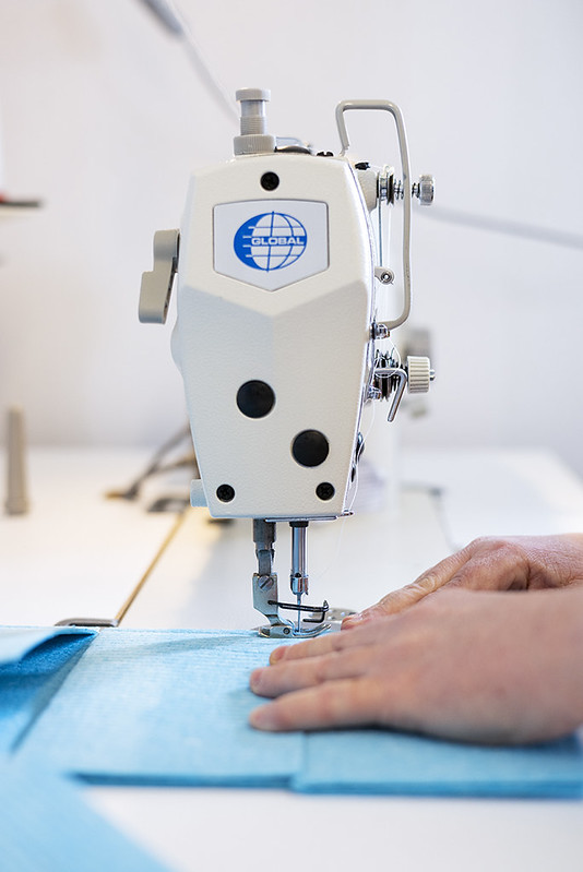 Hon placerar trasan på rätt ställe och syr efter pennmarkeringen och det går i en rasande fart. Det är inte vilken hobbymaskin som helst det här utan en stark och rejäl symaskin som ska klara den tjocka trasan.